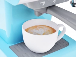 V horní části je uzavíratelná nádržka na vodu, přiložená vyjímatelná páka se snadno zasouvá do kávovaru a správné natočení spustí „napouštění“ šálku. Pohyblivá parní tryska umožní „napěnit“ mléko pro latte nebo cappuccino, takže hra na kavárnu získá úplně nový rozměr.