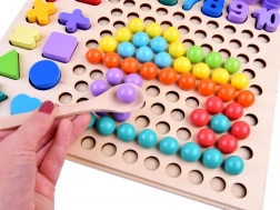 Dřevěná deska s tvary, čísly a symboly učí správnému přiřazení, rozpoznávání tvarů a podporuje logické myšlení při skládání.