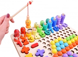 Chyťte barevné rybičky pomocí dřevěné udice s magnetem a umístěte je na správná místa. Zábavná aktivita posiluje koordinaci oko–ruka a trpělivost.