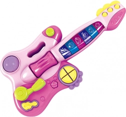 Kytara je vybavena 9 tlačítky, které spouštějí různé melodie a zvuky, a nabízí 3 hudební režimy - pop, rock a blues. Svítící tlačítka, pohyblivý válec a růžová páčka pro změnu písniček přinášejí dynamickou zábavu, zatímco rozšiřovací kulička slouží jako chrastítko.