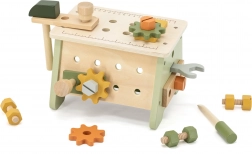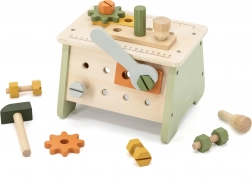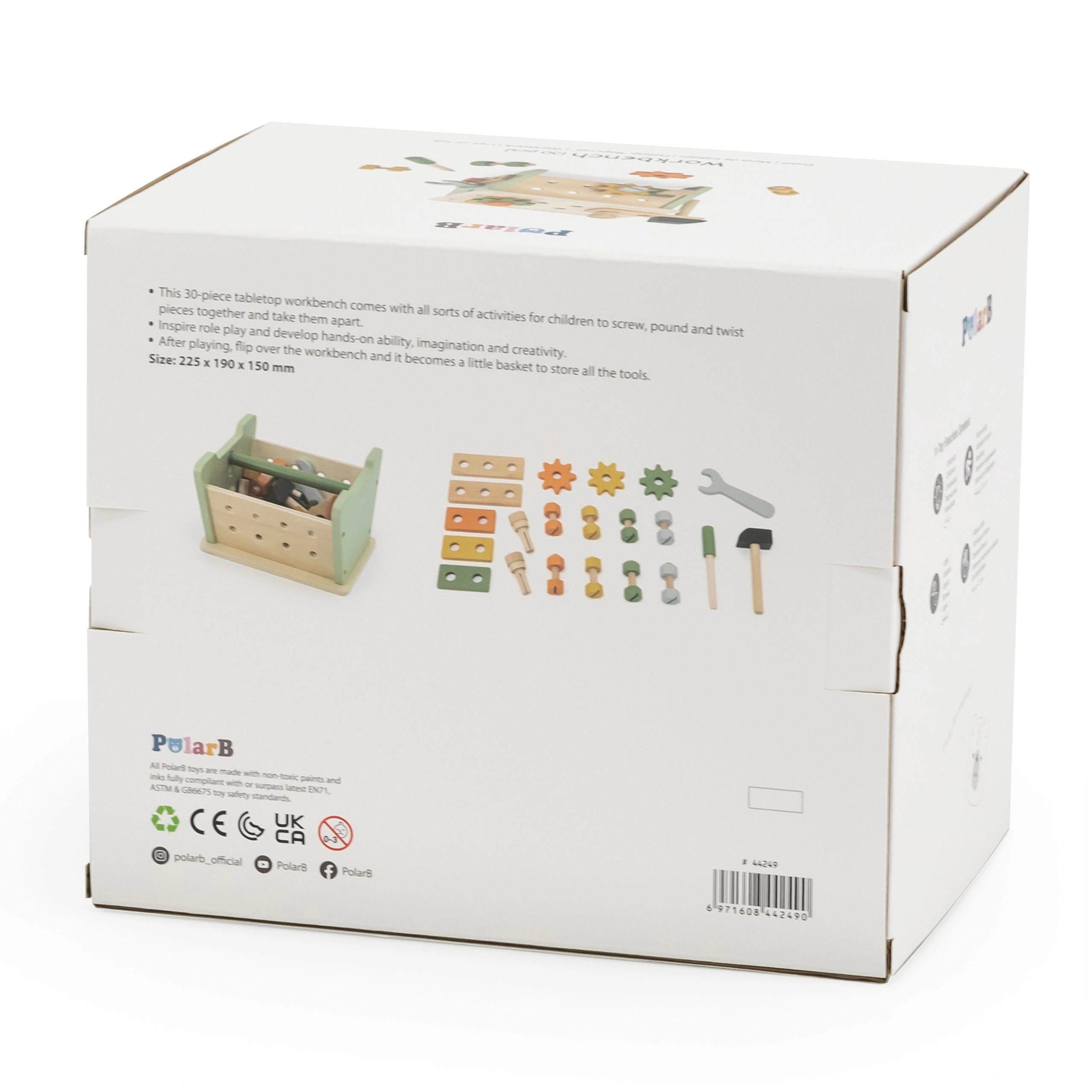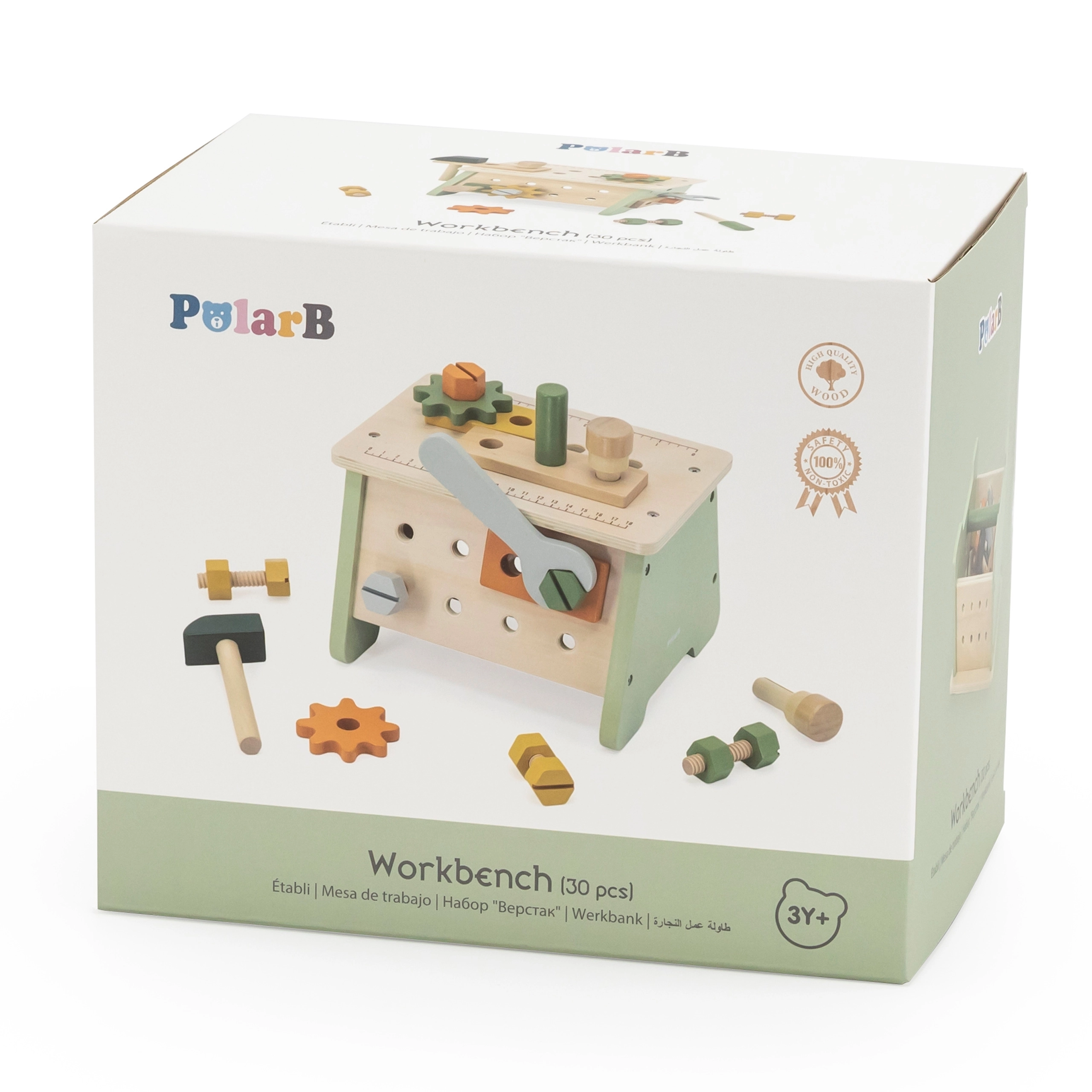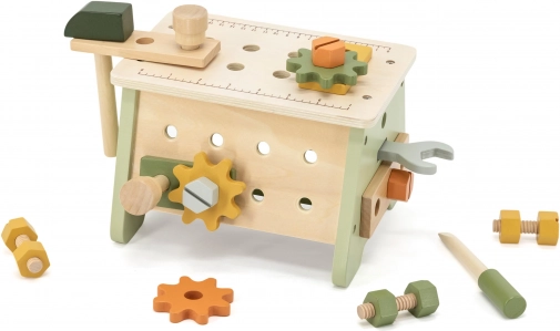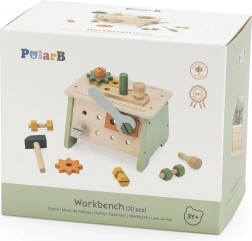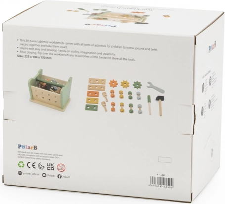 Dřevěný set Viga PolarB mini dílna 2v1 potěší každého malého kutila. Obsahuje 21 dílů včetně kladívka, klíče, šroubováku, šroubů a matek, kolíků a ozubených koleček. Stolek lze převrátit a proměnit na praktickou přepravní a úložnou bedýnku. Hra přirozeně rozvíjí jemnou motoriku, kreativitu a představivost.