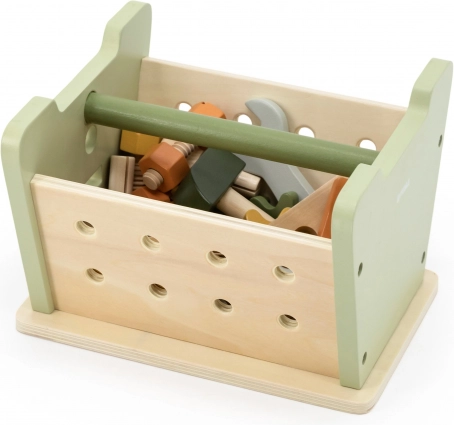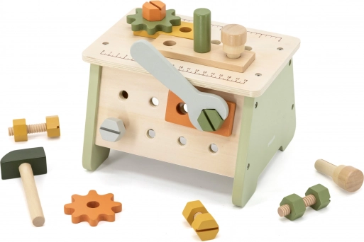 Viga PolarB mini dílna 2v1: dřevěná sada nářadí pro děti 3+. 21 dílů, bezpečné barvy, bez ostrých hran. Stolek se mění na úložnou bedýnku.