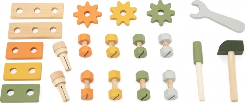 - Obsah balení (21 ks): kladívko, klíč, šroubovák, 4 páry šroubů a matek, 2 kolíky, 3 ozubená kolečka, 5 destiček s otvory