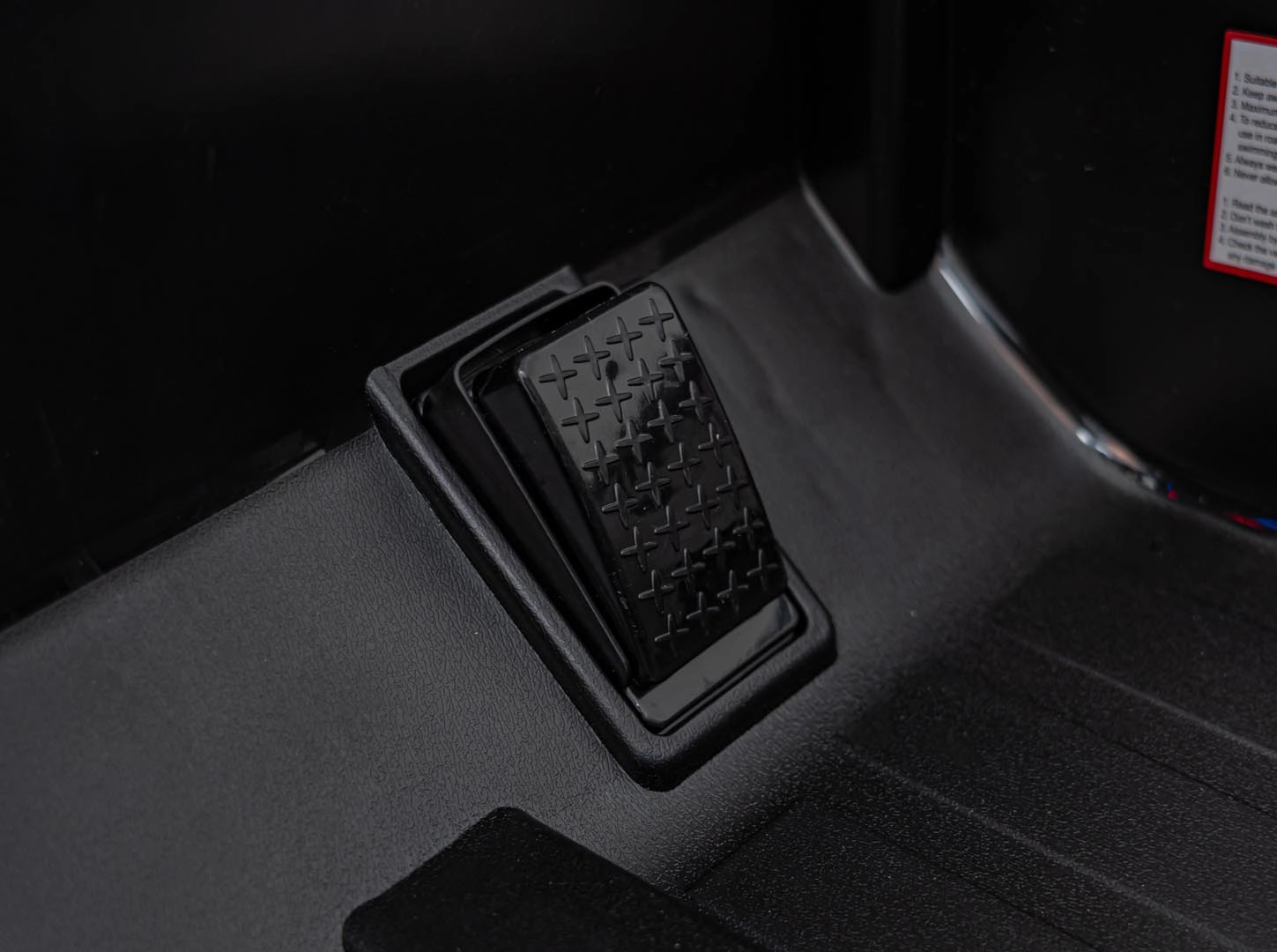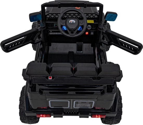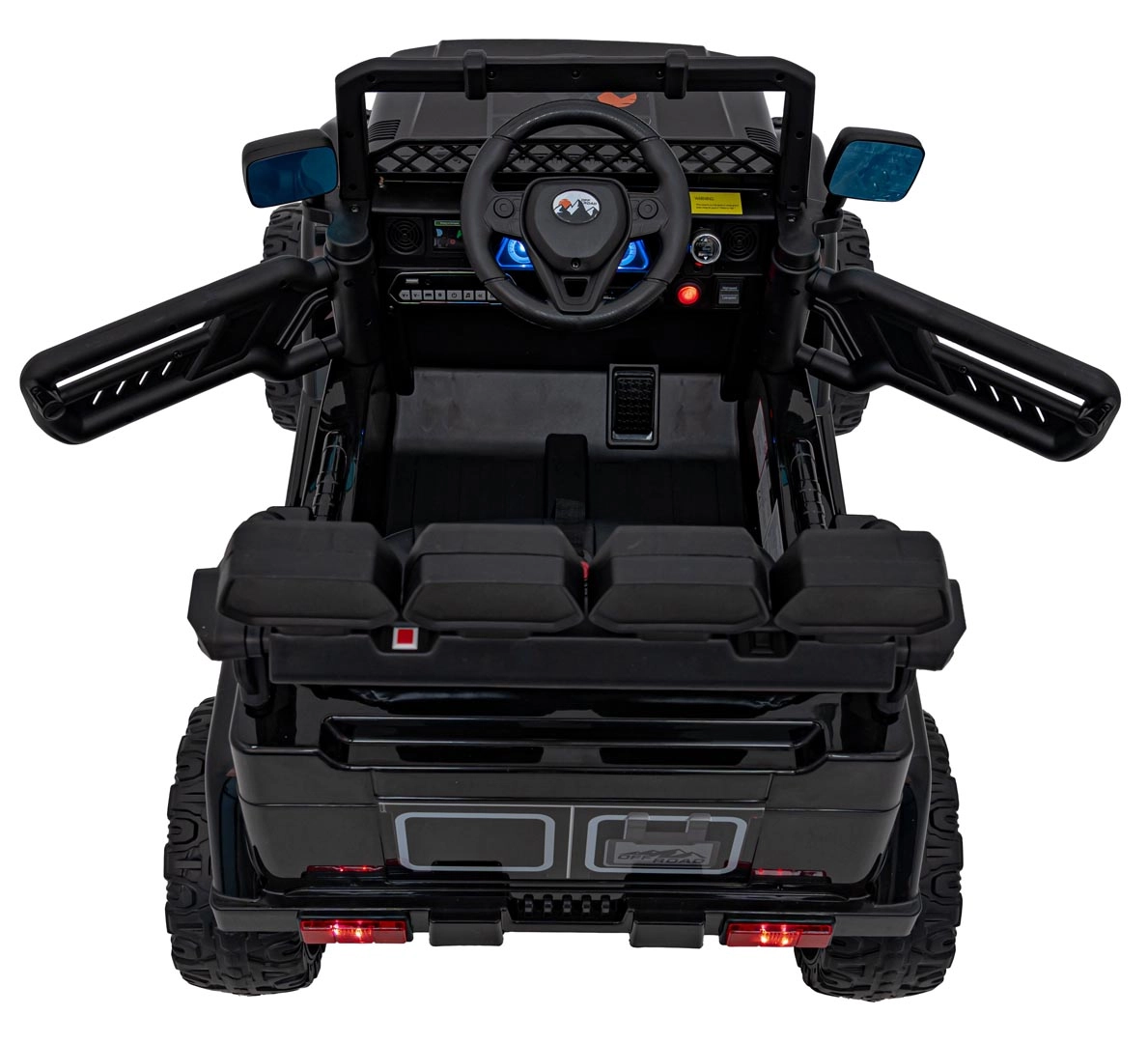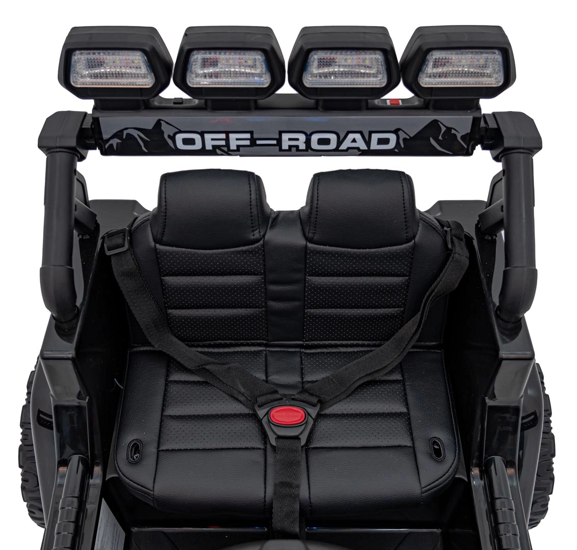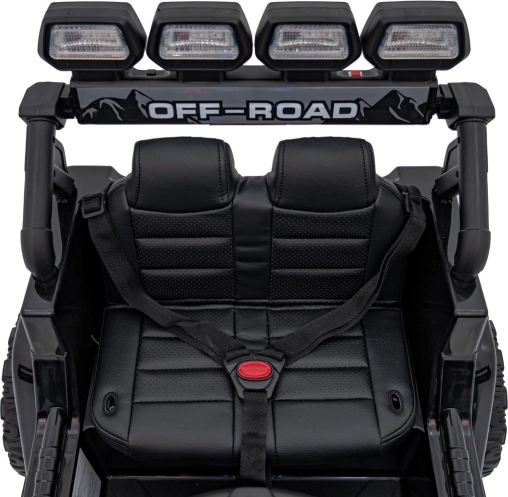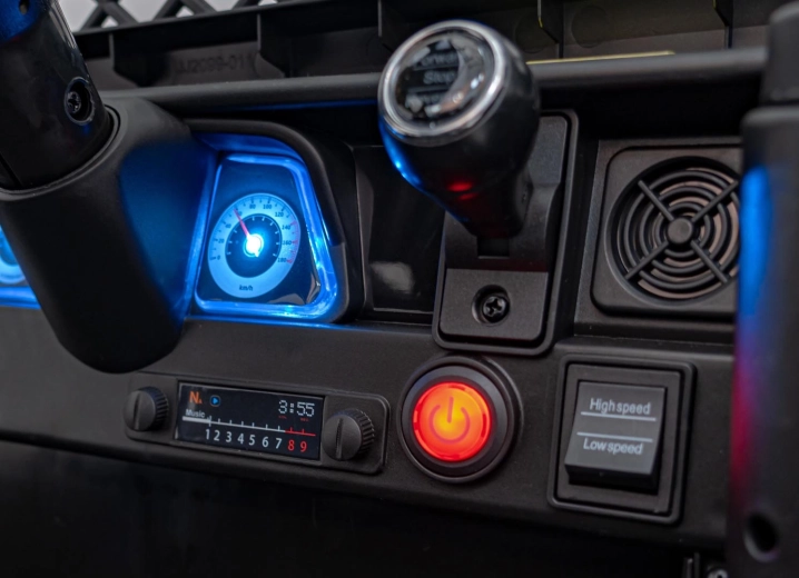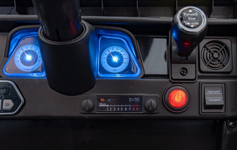 Díky 2.4G dálkovému ovladači máte jízdu dětí pod kontrolou – vyberete ze 3 rychlostí a v případě potřeby použijete bezpečnostní tlačítko Stop. Pomalý start chrání před cuknutím při rozjezdu. Interiér s potahem z ekokůže a bezpečnostními pásy poskytuje komfort, audio panel s USB/MP3/Bluetooth/AUX a klaksonem na volantu se postará o zábavu.