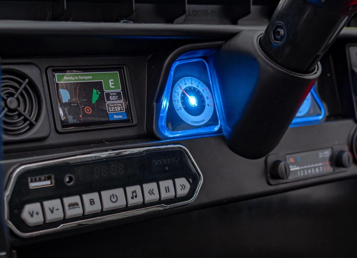- USB, MP3, Bluetooth, AUX, vestavěné melodie, klakson a tlačítka na volantu