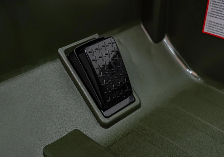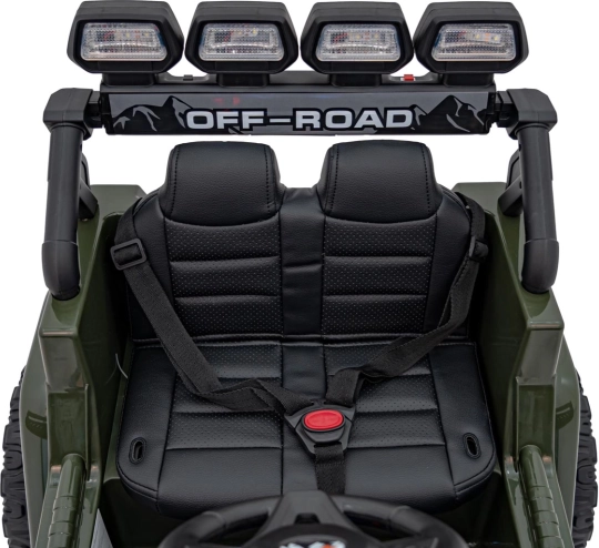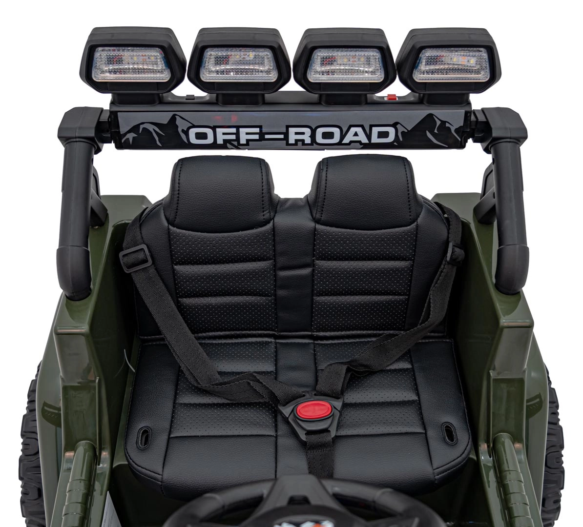 Realistický vzhled podtrhují funkční LED světlomety, horní světla a otevírací dveře. Interiér potěší audio panelem s připojením USB/MP3/Bluetooth/AUX a multifunkčním volantem s klaksonem a melodiemi. Sedadlo z eko kůže s bezpečnostními pásy zajistí komfort a jistotu.