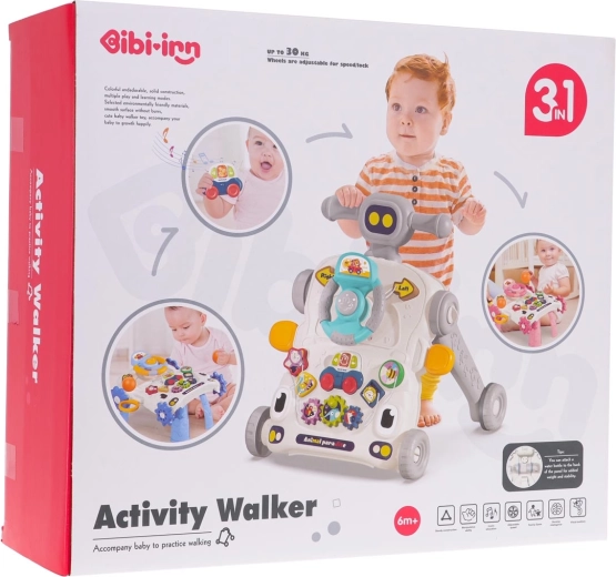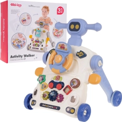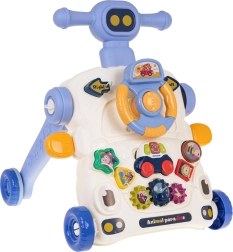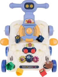 Toto multifunkční chodítko potěší rodiče i děti: slouží jako opora při prvních krůčcích a zároveň jako stolek s aktivitami pro hravý rozvoj. Panel nabízí volant s píšťalkou, převody, tvarový sorter a mini koš na házení míčkem – vše navržené tak, aby posilovalo koordinaci, soustředění a motorické dovednosti.