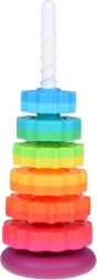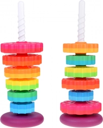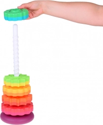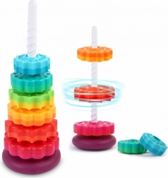 Stohovací kroužky s různými texturami podporují smyslové vnímání a soustředění. Skládání od největšího k nejmenšímu pomáhá rozvíjet logiku, trpělivost a rané matematické dovednosti. Jasné barvy podporují vizuální stimulaci a učení barev.