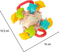 Silikonové části slouží jako bezpečné kousátko, které uleví citlivým dásním. Kulička motivuje děti k uchopování, otáčení a přendávání z ruky do ruky, čímž přispívá k rozvoji jemné motoriky a koordinace oko–ruka.
