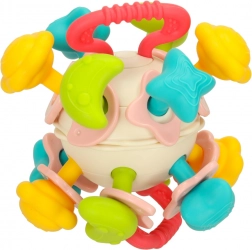 Tato lehká a snadno uchopitelná senzorická hračka kombinuje plastové a silikonové prvky, které děti lákají k prozkoumávání. Kontrastní barvy a více druhů povrchů podporují zrakovou i hmatovou stimulaci, zatímco jemný chrastící zvuk rozvíjí sluchové vnímání.
