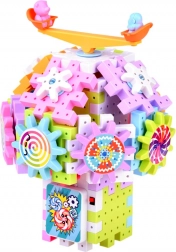 Sestavovací souprava obsahuje ozubená kolečka a malé lopatky se zvířátky, které se mohou otáčet, což rozvíjí koordinaci a schopnost řešit problémy.