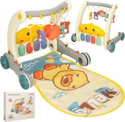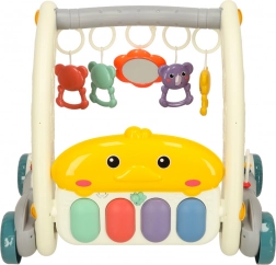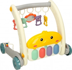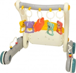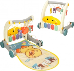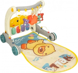 Toto chytré řešení kombinuje pohodlnou hrací podložku pro miminka na bříšku i na zádech a později se promění ve stabilní chodítko pro první krůčky. Díky závěsným hračkám a hudebnímu pianu dítě přirozeně rozvíjí zrak, hmat, sluch i koordinaci ruka–oko.