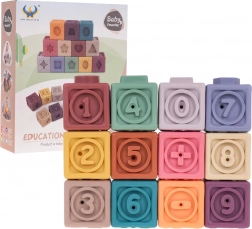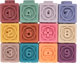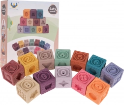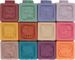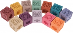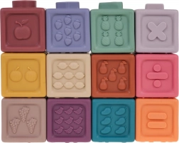 Set obsahuje 12 různobarevných silikonových kostek, které podněcují zrakovou stimulaci a kreativitu dětí.