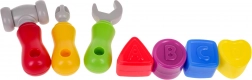 Pod deskou je otevíratelný šuplík, kam si děti mohou uschovat nářadí a bloky ve tvaru různých písmen a tvarů. Dílna je napájena třemi bateriemi typu AG13, které jsou součástí balení.