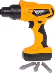 Realistická vrtačka šroubuje i vyšroubovává, vydává zvuky, má výměnné bity (plochý, křížový, vrták) a odnímatelný „akumulátor“. Napájení: 2× AA 1,5 V (nejsou součástí).