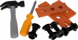 Kladivo, šroubovák, šrouby, destičky s otvory a další doplňky otevírají prostor pro volnou stavbu, trénink jemné motoriky a rozvoj představivosti.