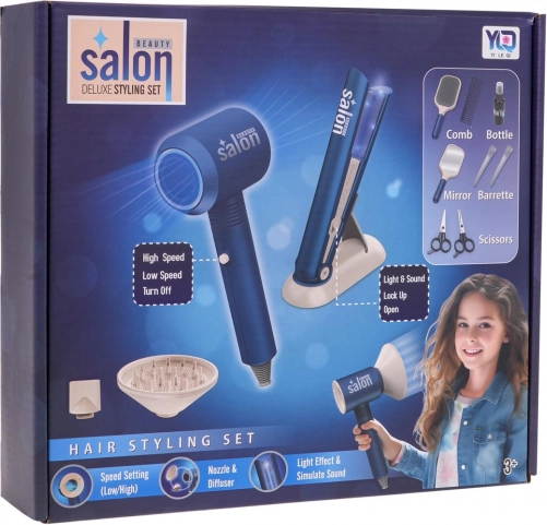 Tento bohatě vybavený kadeřnický set v modré barvě nabídne dětem hodiny zábavy a fantazie. Hlavní hvězdou je susžka na baterie s výměnnými nástavci, která skutečně fouká a zní jako opravdová. Prosťejnovací žehlička svítí a vydává realistické zvuky, takže hraní na salon krásy působí autenticky.
