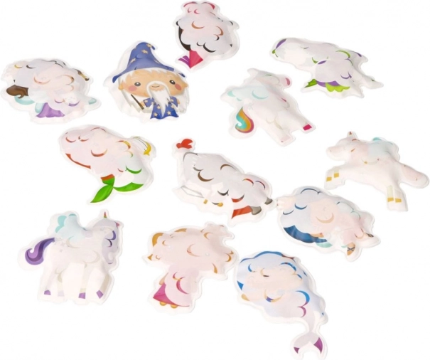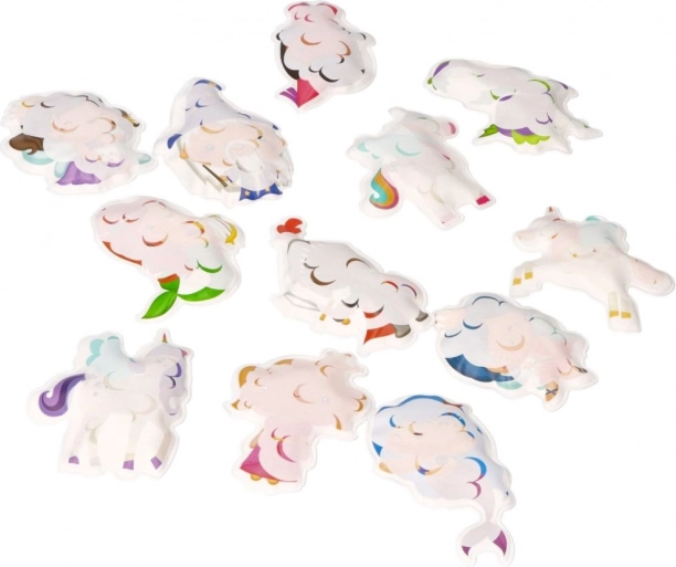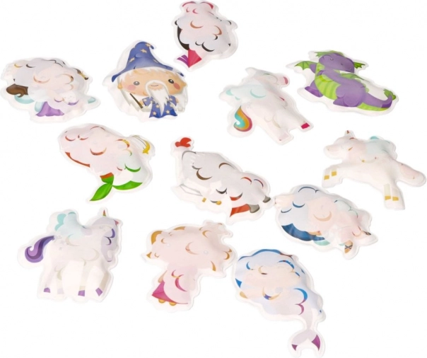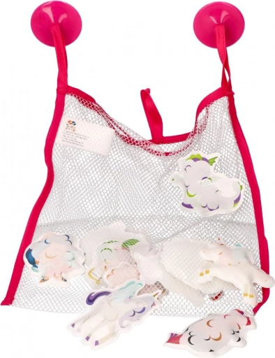 Set zábavných pěnových samolepek s motivy jednorožců, kouzelníků a obláčků přináší do koupele spoustu fantazie. Po kontaktu s vodou samolepky mění barvu a na hladkých mokrých plochách (vana, obklady) perfektně drží. Po skončení hry je snadno uložíte do prodyšné síťky s přísavkami, která umožní rychlé odkapání a sušení.