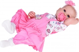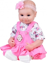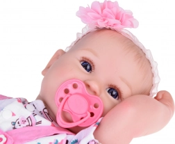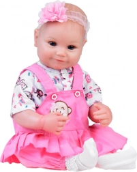 Tato roztomilá panenka miminko je vyrobena z kvalitních materiálů s důrazem na detaily – má měkké tělíčko, gumové pohyblivé ručičky a nožičky a realistické rysy obličeje s modrýma očima a dlouhými řasami. Hlava je s malovanými vlásky, takže je ideální i pro nejmenší pečovatelky. Obleček v růžových tónech s motivy zvířátek a květinovou čelenkou dodává panence jemný a něžný vzhled.