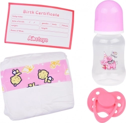 Součástí je lahvička, magnetický dudlík, plenka a certifikát narození – vše pro realistické pečování o miminko.