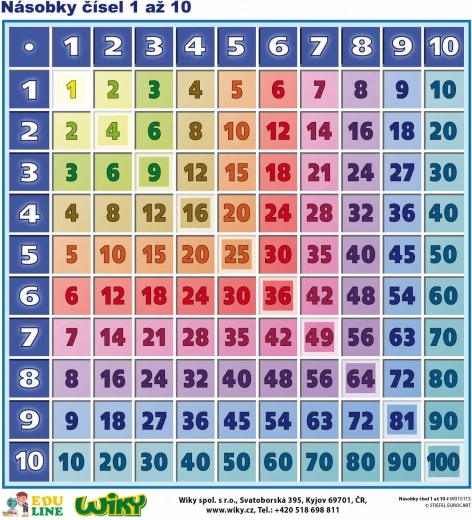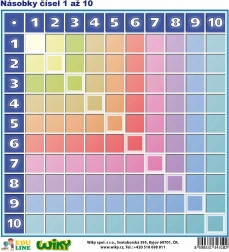 Tato praktická pomůcka nabízí jasné a barevně rozlišené řady násobků od 1 do 10, které dětem usnadňují pochopení vztahů v násobilce. Díky oboustrannému provedení můžete kombinovat učení s aktivním procvičováním – přední strana s výsledky pro vysvětlení, zadní strana bez výsledků pro ověřování znalostí.