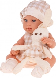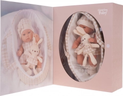 panenka–miminko, přenosný textilní košík s uchy, plyšový králíček, dárkové balení