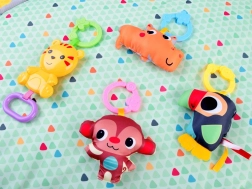 Závěsné hračky, kontrastní barvy a různé textury podporují zrak, hmat i koordinaci oko–ruka.