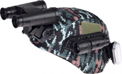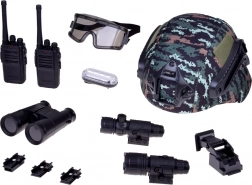 Maskáčová helma s nastavitelným podbradním páskem a měkkým polstrováním pohodlně sedí a díky úchytům umožňuje montáž doplňků: světla, zaměřovačů a dalekohledu. Dalekohled skutečně přibližuje a lze upravit jeho rozteč pro lepší vidění. Ochranné brýle doplňují výbavu, aby se děti cítily jako skuteční vojáci.