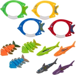 Užijte si léto s touto velkou sadou potápěčských hraček do bazénu! Barevné rybky, prstence, tyčky, rekiní torpéda a pirátský poklad promění každé koupání v dobrodružství. Hračky rychle klesají na dno, jsou dobře viditelné a mnohé mají bodové označení pro soutěže. Součástí je lehký rychleschnoucí vak pro snadné přenášení.