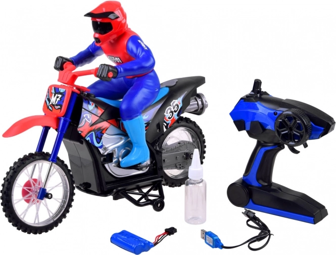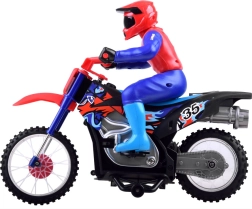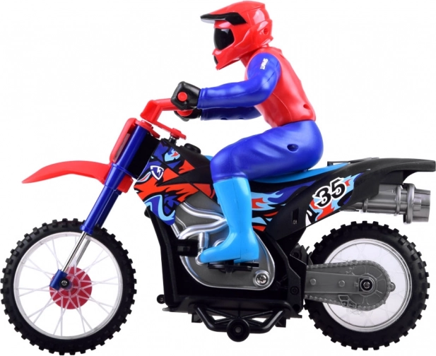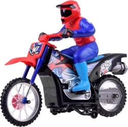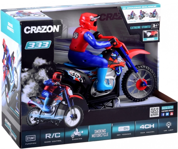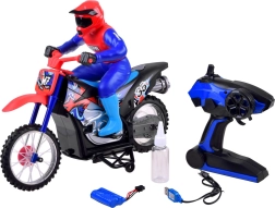 Tato zábavná RC motorka typu CROSS s jezdcem je promyšleně zpracovaná do posledního detailu. O realistický zážitek se stará svítící výfuk a možnost zapnout jízdu se skutečně vypadajícím kouřem nebo bez něj. Přední i zadní část je odpružená, gumové pneumatiky zajišťují dobrou trakci a pomocný podvozek s kolečky drží motorku stabilně i při ostřejších manévrech.