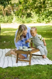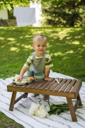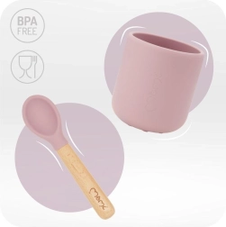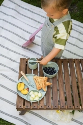 Jídelní náčiní je vyrobeno z měkkého silikonu bezpečného pro styk s potravinami a je bez BPA a ftalátů. Silikonové části lze mýt v myčce a používat v mikrovlnné troubě. Dřevěné rukojeti příborů jsou ergonomické a příjemné do dětské ruky. Součástí je i komfortní bryndák s hlubokou kapsou, který zachytí drobky a kapky.