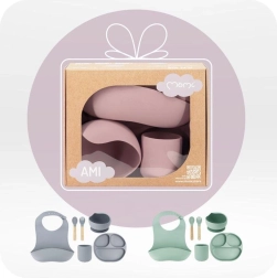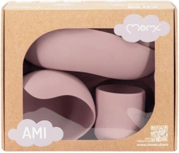 Sada MoMi Ami je navržena pro pohodlné a bezpečné první krmení. Zvýšené okraje a třídílný talíř usnadňují nabírání a rozdělení porcí, zatímco silné přísavky na misce i talíři drží nádobí pevně na stole či podnosu jídelní židličky. Hrneček 180 ml a miska 360 ml mají ideální velikost pro každodenní používání.