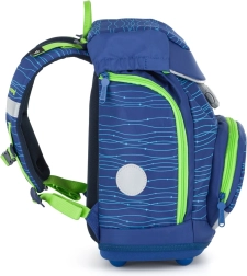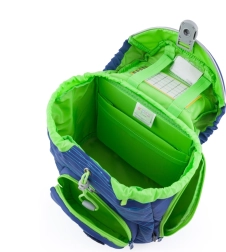 Set OXY Sherpy Blue je spolehlivá volba pro děti od 1. do 3. třídy. Hlavní komora se stahovací šňůrkou a magnetickým zapínáním umožňuje snadné otevírání jednou rukou, vnitřní rozřaďovač udržuje pořádek v učebnicích a sešitech. Přední kapsa na svačinu a boční kapsy na zip poskytují další přehledné úložiště.