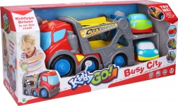 S touto odtahovou soupravou Kiddy zažijí děti spoustu realistické zábavy. Odtahovka s dvěma plošinami a sklápěcí rampou umožní snadno naložit přiložená autíčka, zatímco světelné a zvukové efekty dodají hře autentickou atmosféru. Díky volným kolům se vozidla hladce pohybují po podlaze.