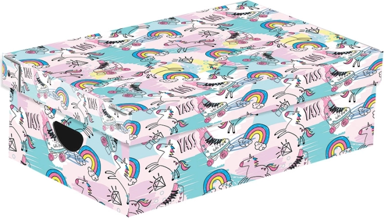 Lamino krabice s víkem a výřezem na úchytky pro snadnější manipulaci. Vhodná k uchování různých předmětů od dokumentů až po hračky.