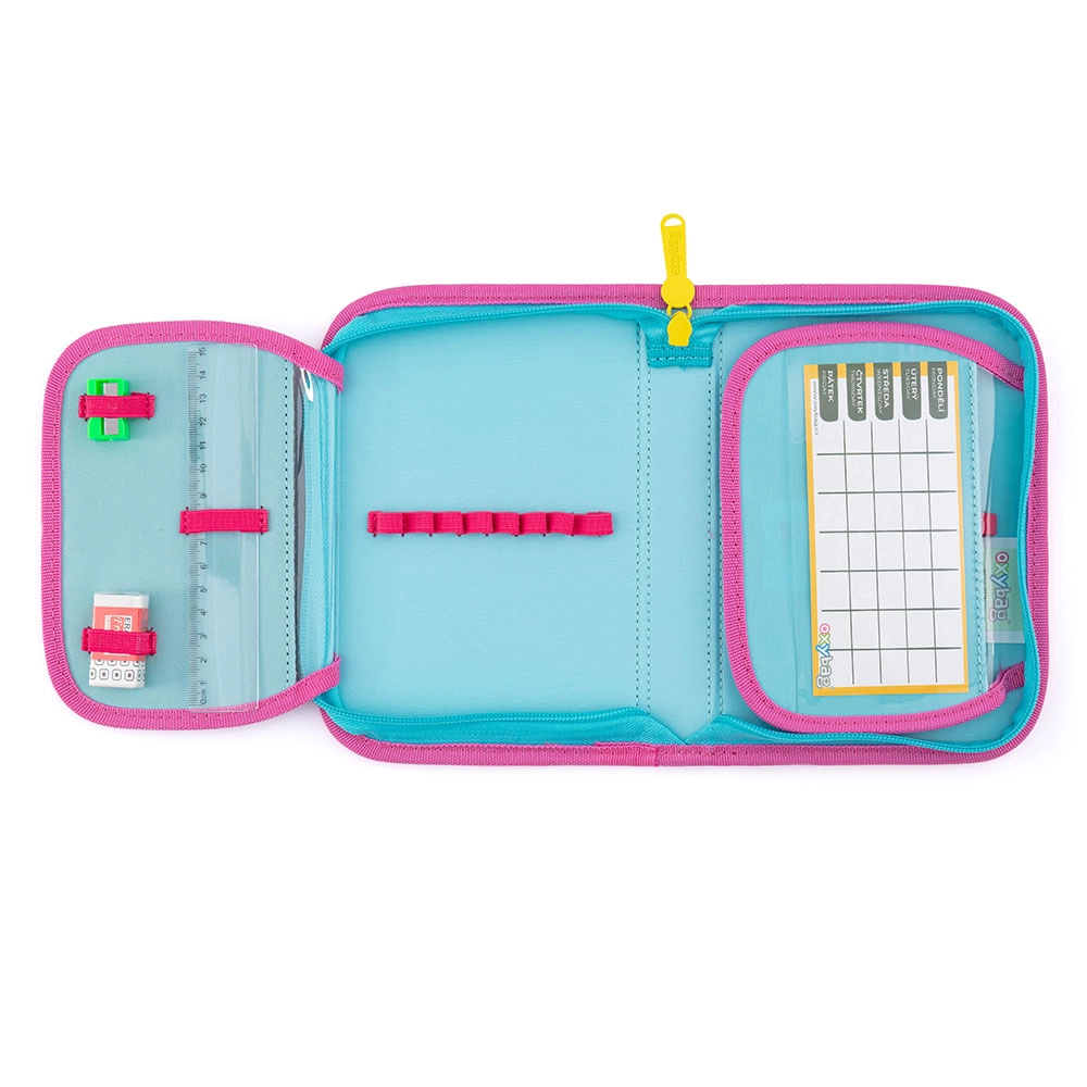 Na vnitřních chlopních najdete průhledné fólie vhodné pro vložení rozvrhu hodin nebo poznámek. Penál je prázdný, takže si jej můžete vybavit přesně podle svých potřeb.