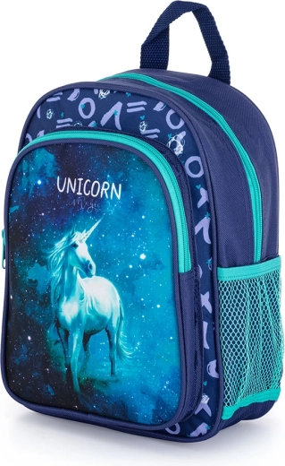 Lehký a pohodlný dětský batoh s kouzelným motivem jednorožce potěší malé průzkumníky od 3 do 6 let. Nabízí prostornou hlavní komoru, přední kapsu na svačinu a postranní síťovanou kapsu na láhev. Díky nastavitelným polstrovaným popruhům a odolnému textilnímu materiálu je ideální na školku, kroužky i výlety.