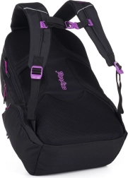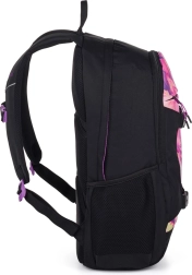 Černý základ doplňuje růžovo‑fialový mramorový vzor a výrazné detaily. Batoh se hodí do školy, do práce i na volný čas.