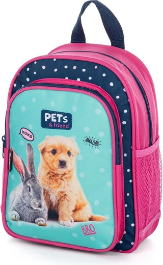 Lehký a pohodlný dětský batoh s motivem mazlíčků pro předškoláky od 3 do 6 let. Nabízí jednu prostornou hlavní kapsu, menší kapsu na svačinu a postranní kapsičky na láhev. Ideální na kroužky, výlety i do školky.