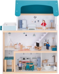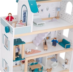Domeček je vybaven několika pokoji a funkčním výtahem, což poskytuje dětem realistický a obohacující zážitek.