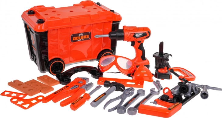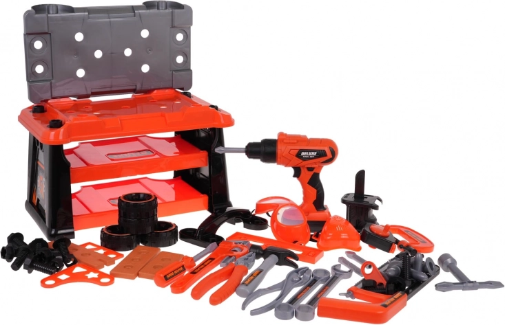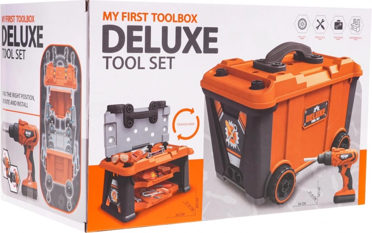 Tato bohatě vybavená sada nabídne dětem realistický zážitek z práce v dílně. Snadno z ní postavíte stabilní pracovní stolek a po hře vše uložíte do přenosného kufříku na kolečkách. Hlavní hvězdou je bateriová vrtačka/šroubovák s vyměnitelnými bity a nástavcem s pilou, která umí šroubovat i vyšroubovávat – jako doopravdy.