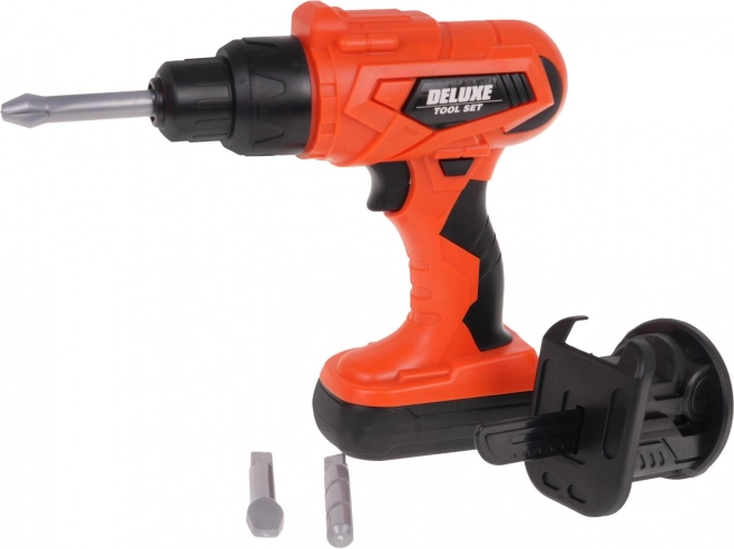 Dětská vrtačka/šroubovák napájená 2× AA umí šroubovat i vyšroubovávat. Součástí jsou 3 výměnné bity a nástavec s pilou pro ještě více zábavy.
