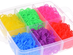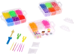 - cca 4500 ks gumiček, průhledné spojovací háčky, barevné/pastelové korálky, 6× malé háčky, 1× velký háček, 2× prak, 2× krosno, 6× silikonový přívěsek, průhledný organizér s přihrádkami