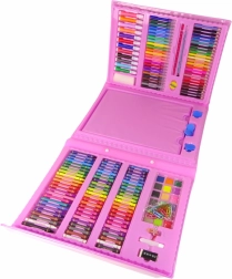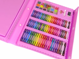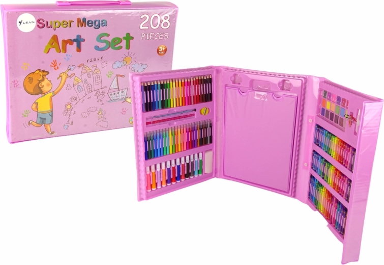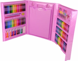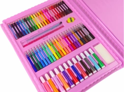 Tento růžový výtvarný kufřík nabízí bohatou paletu nástrojů pro malé umělce: fixy, pastelky, voskovky, olejové pastely, akvarelové barvy a praktické pomůcky. Díky přehlednému uspořádání má dítě vše po ruce a může se naplno soustředit na tvorbu.