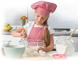 Dívka v kuchyni, která hravě učí děti základům pečení a vaření.