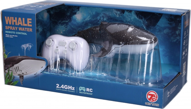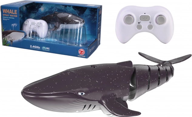 Dálkově ovládaná velryba s vodotryskem a světelnými efekty. Frekvence 2.4GHz, rozměry 35x12x8 cm. Perfektní hračka pro zábavu!