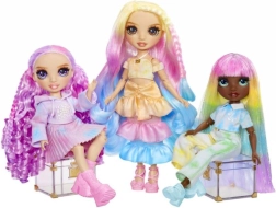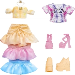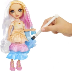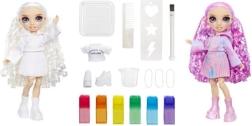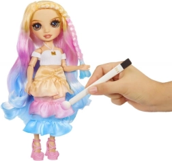 Vytvoř si svou vlastní panenku RAINBOW HIGH! Bílý outfit i vlasy můžeš ozdobit pomocí 6 smývatelných duhových prášků, gumiček na batikování a aplikační houbičky. Barvi oblečení i vlasy, potom vše jednoduše opláchni a vybarvi znovu – zábava bez konce a pokaždé jiný styl.