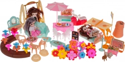 Součástí je plně vybavený nábytek, zahradní houpačka, slunečník, zvířátka i skútr. Tři panenky mají pohyblivé končetiny a dlouhé vlasy ideální k česání.
