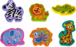 Součástí jsou dřevěné figurky zvířat: zebra, lev, slon, páv, žirafa a krokodýl. Skvělé pro samostatnou hru i společné tvoření s rodiči.