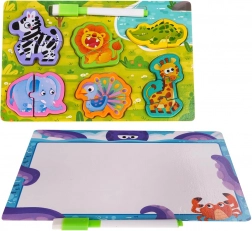 - 2 v 1 – kreslící tabule + puzzle s výřezy pro zvířátka.